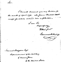 | Submission of Returns for April 1796, with James Hackett's Contract Receipts | Collection: Second Congress: Reports and Communications Submitted to the Senate by the Secretary of the Treasury [2A-F2] (RG46) | B:4 |