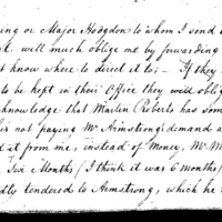 Colo: Pickering or Major Hodgdon to whom I send this open for their perusal, will much oblige me by forwarding it to Mr. Roberts as I do not know where to direct it to; - If they will direct a copy of it to be kept in their office they will oblige me ----I must acknowledge that Martin Roberts has some excuse in regard to his not paying Mr. Armstrong's demand at the time he received it from me, instead of money, Mr. Morris's notes payable in six months (I think it was 6 months) there I know he repeatedly tendered to Armstrong, which he refused over x over