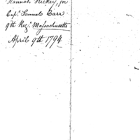 Certification of service and settlement of pay to Hannah Hickey, for Samuel Carr, late captain in the 9th Massachusetts Regiment.