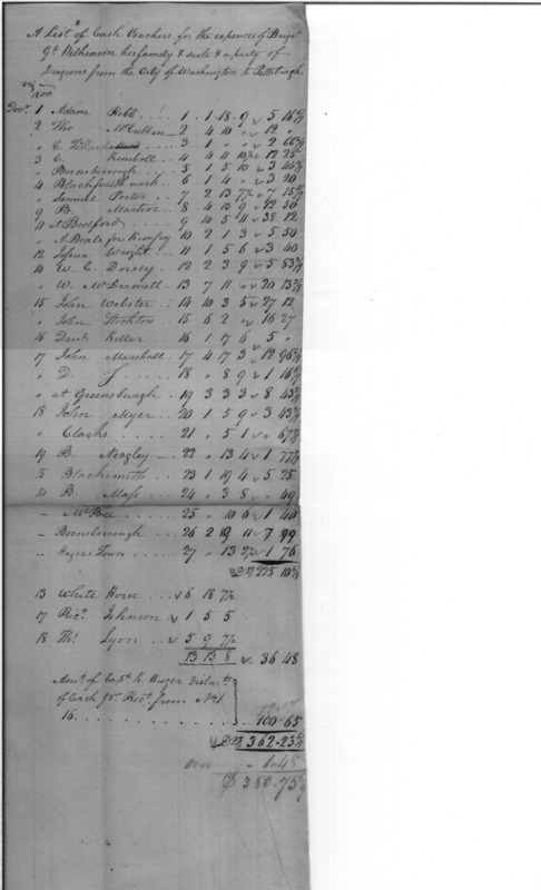 A List of Cash Vouchers. for the expenses of Brigad Ge Wilkinson his family & suite & a party of Dragoons from the City of Washington to Pittsburgh.