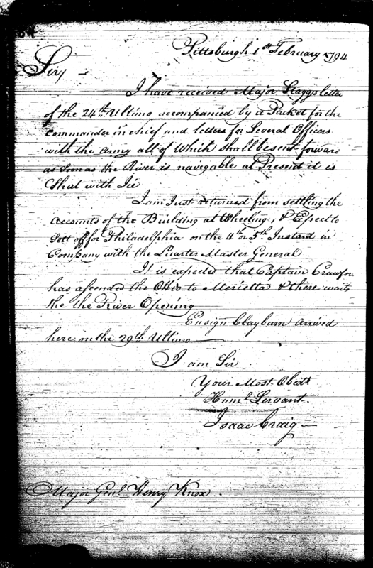 - Document: Major Craig sends status report from Fort Pitt to the Secretary at War