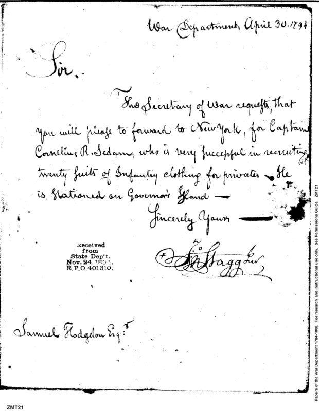 - In source: Collection: Post Revolutionary War Papers, 1784-1815. (RG94)