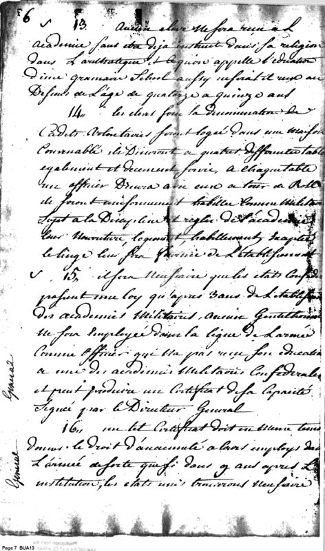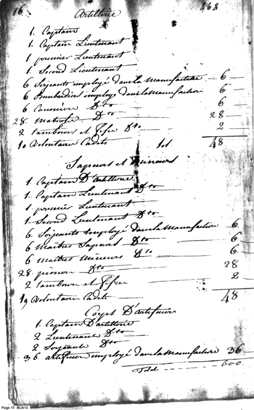 Document ViewerProject l'establishment des acadimies a manufactureer militaries calculee pour produre dous L espure de neufs aud le noumbre des officers instruits [davi] les destereiter branches des [seicurer] militaries, at de sergents disciplines pour un armee de 3000 hommes. Les manufactures prod[unious] dous le [mieve] esp[acdetent] l'artilleries a siege et au Canprague les armes a seu les [a ] blanket, la produce canon les affects et trains d'artilleries et les a[untrements] necessaries pour au armee et 3000 hommes.
