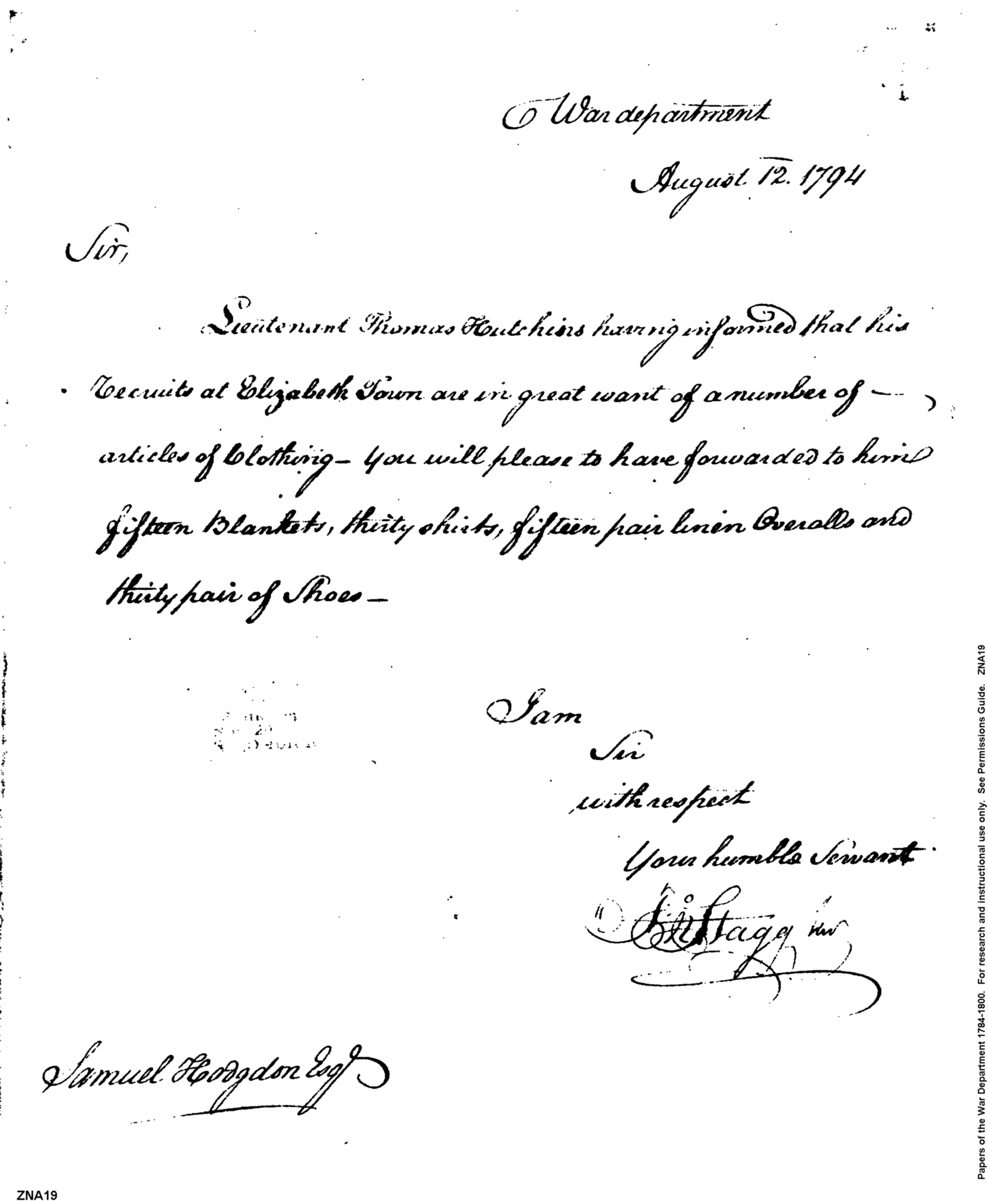 - Document: Articles of Clothing for Hutchins' Recruits