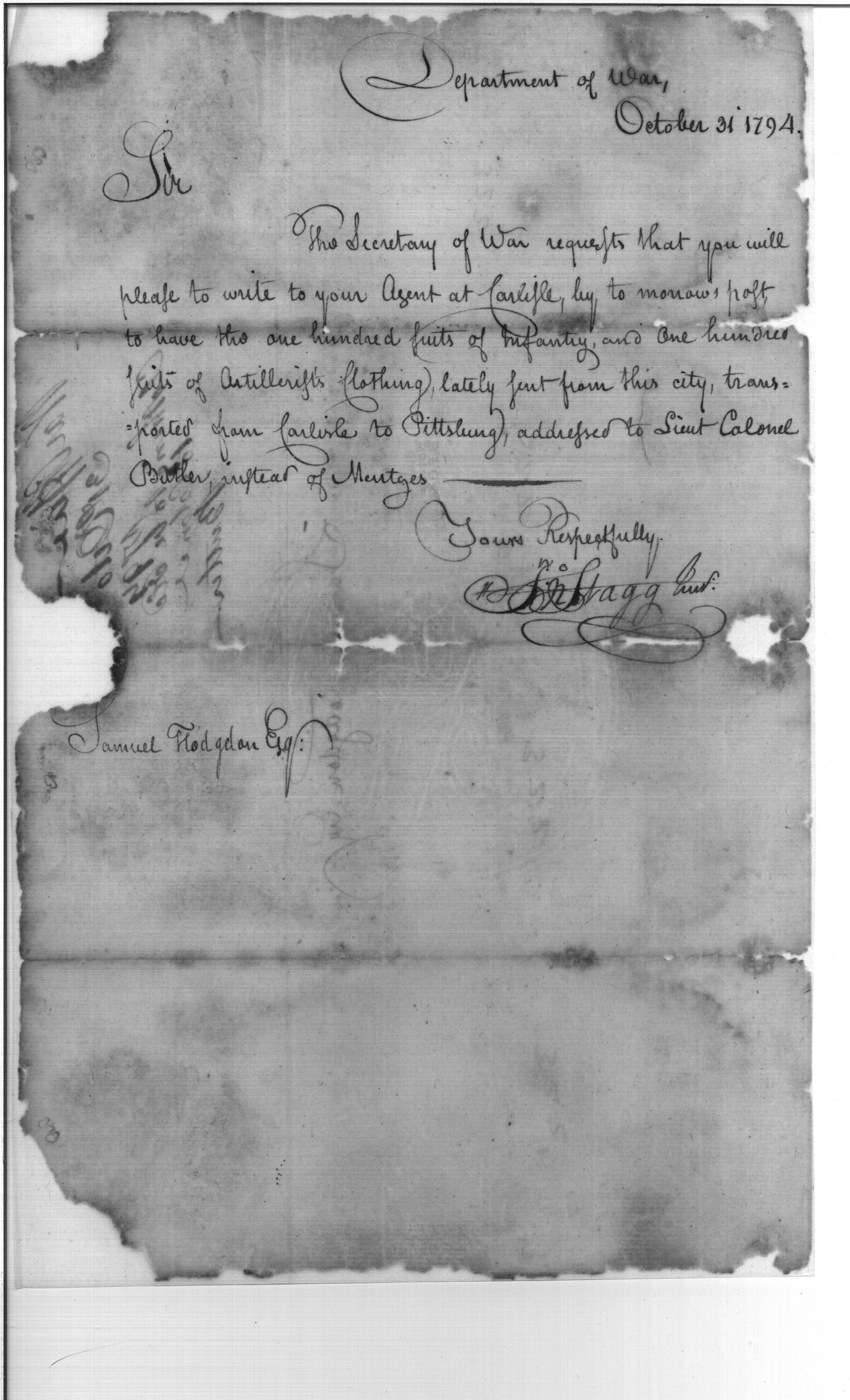 - Document: Suits of Infantry & Artillery Clothing to Pittsburgh
