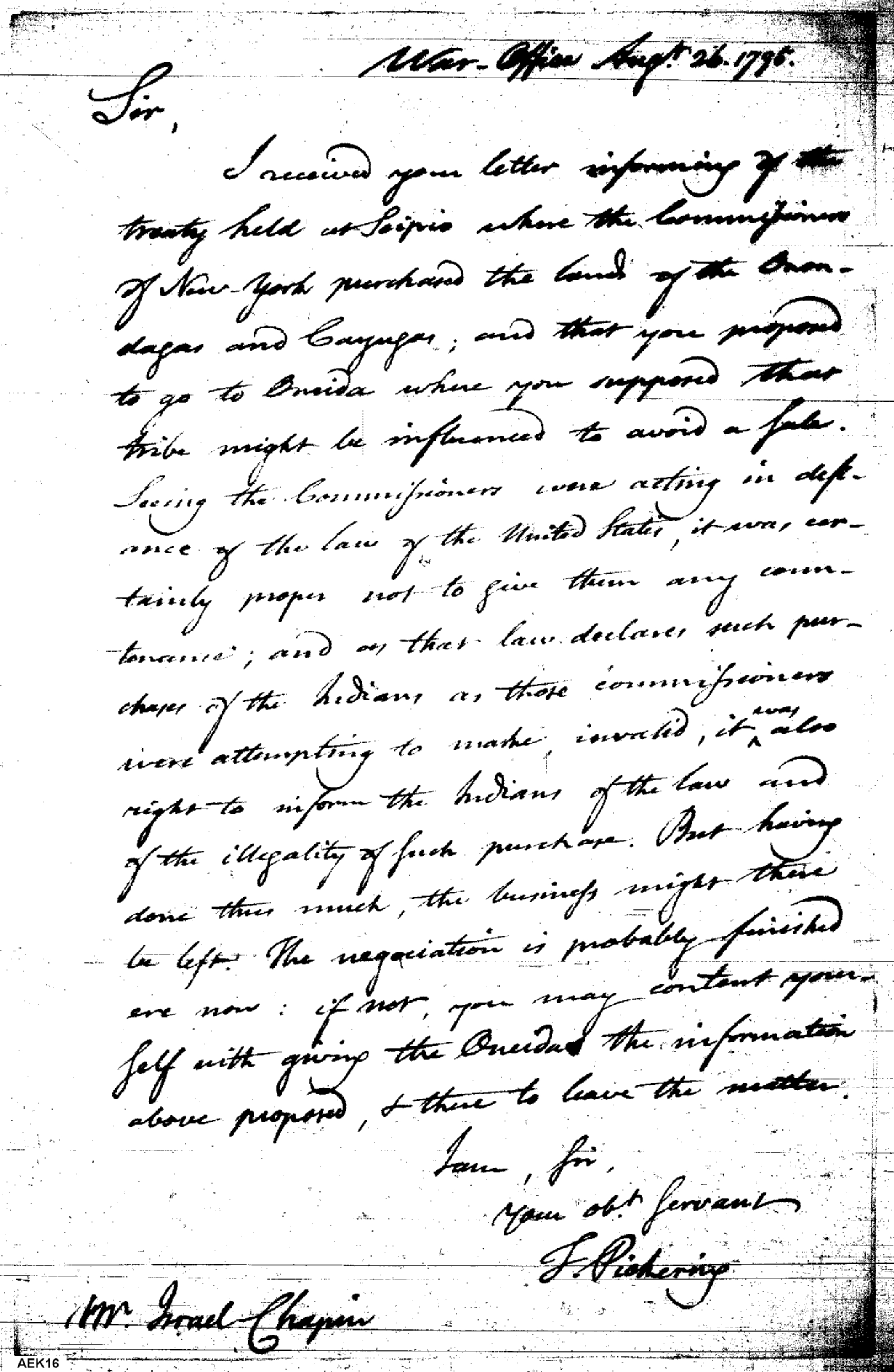 - Document: Pickering asks Chapin to inform the Oneidas of U.S. law