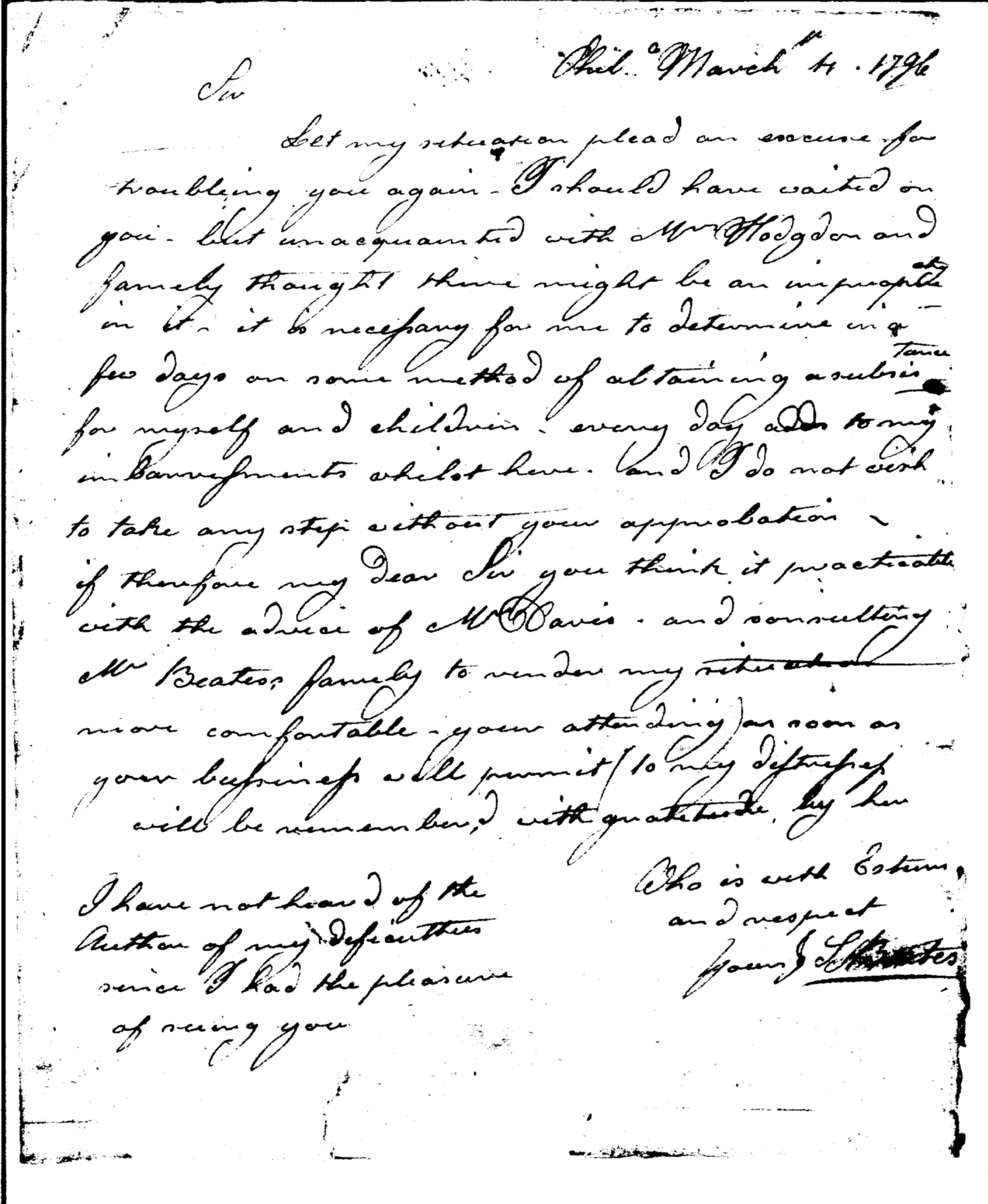- Document: Request to Samuel Hodgdon from S. Beates for assistance for self & family