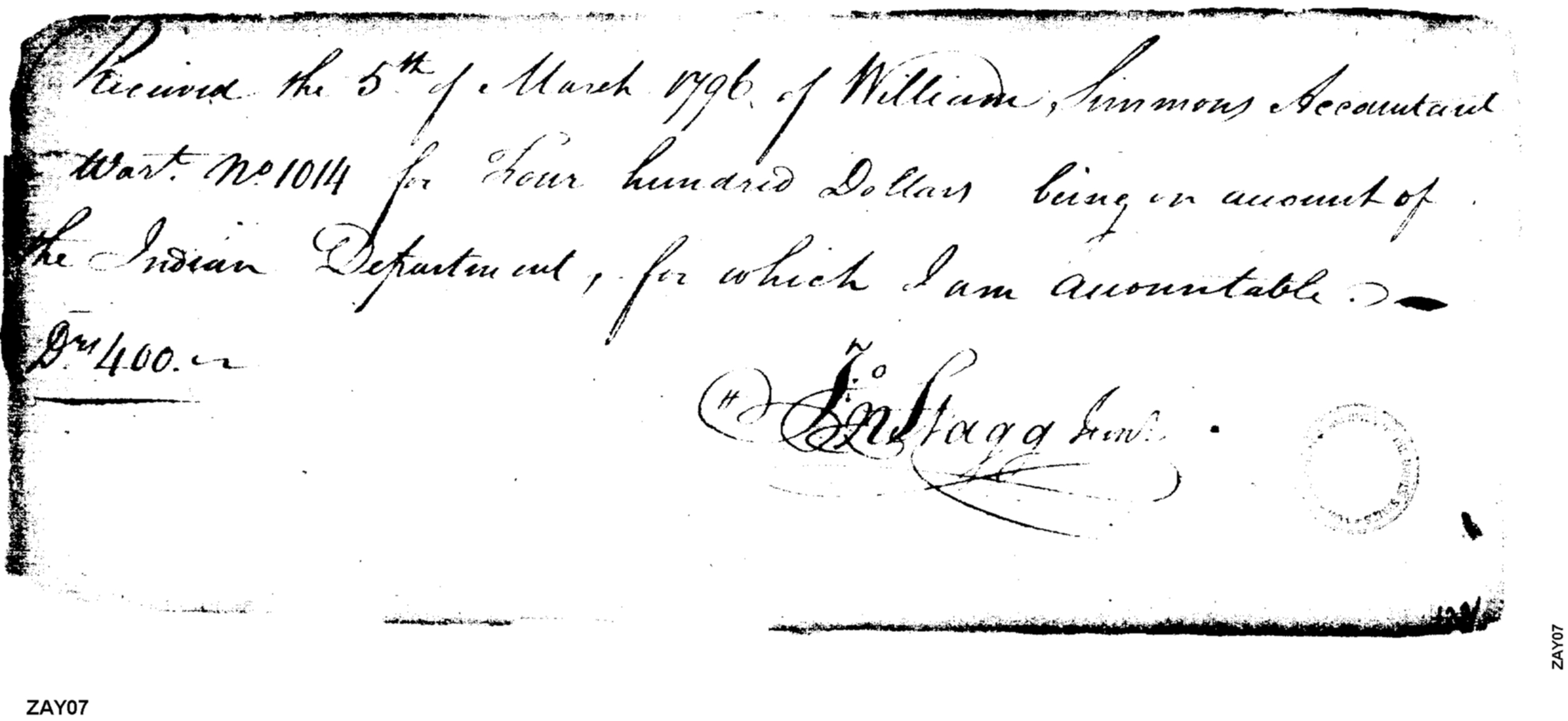 - Document: Receipt of Simmons on Account of Indian Department