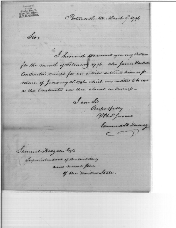 - Document: Edmund Quincy submission of returns for February 1796; includes Contractors' receipts from James Hackett