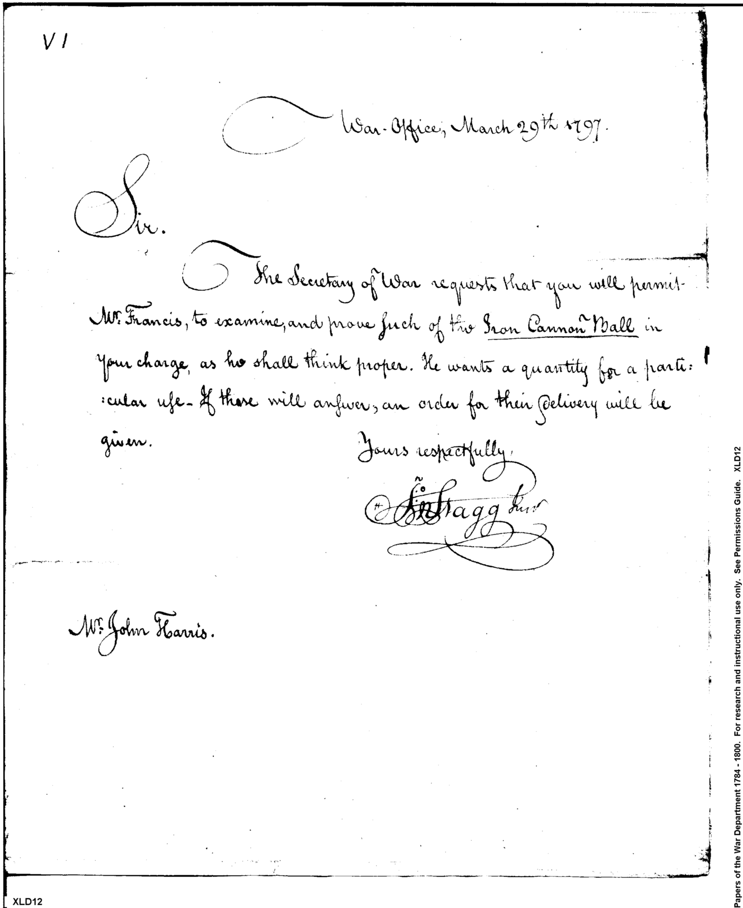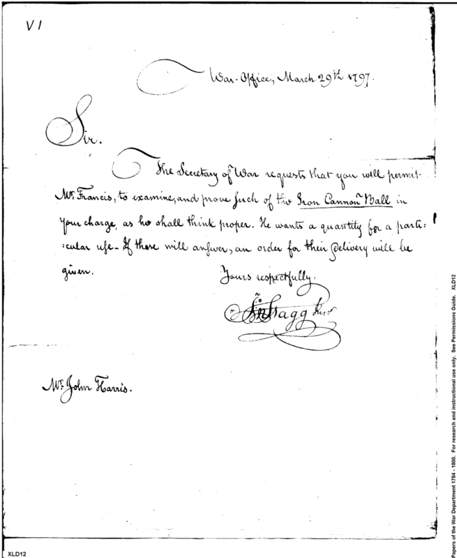 - Document: Permission for Tench Francis to Examine Cannon Balls