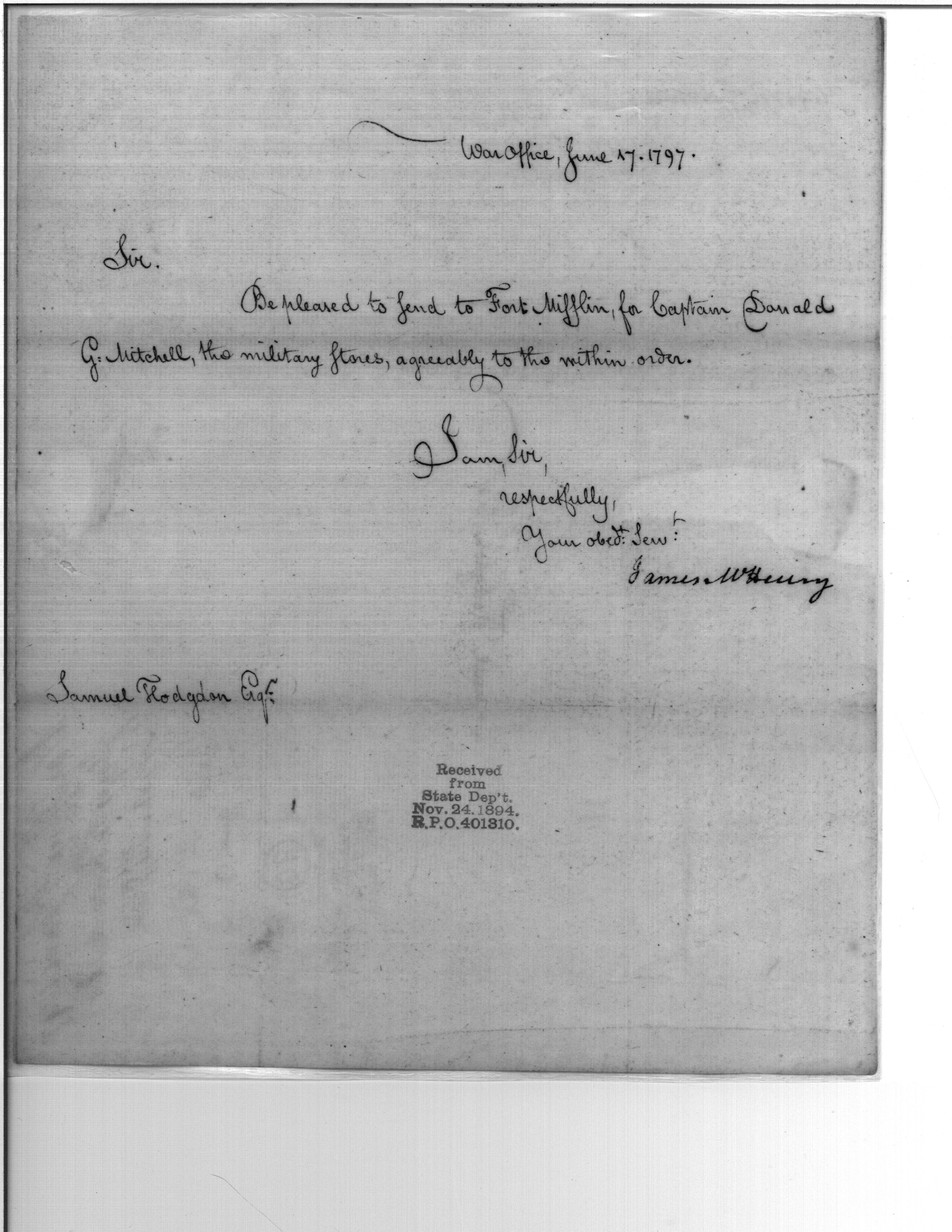 - Document: Military Stores for Captain Mitchell at Fort Mifflin