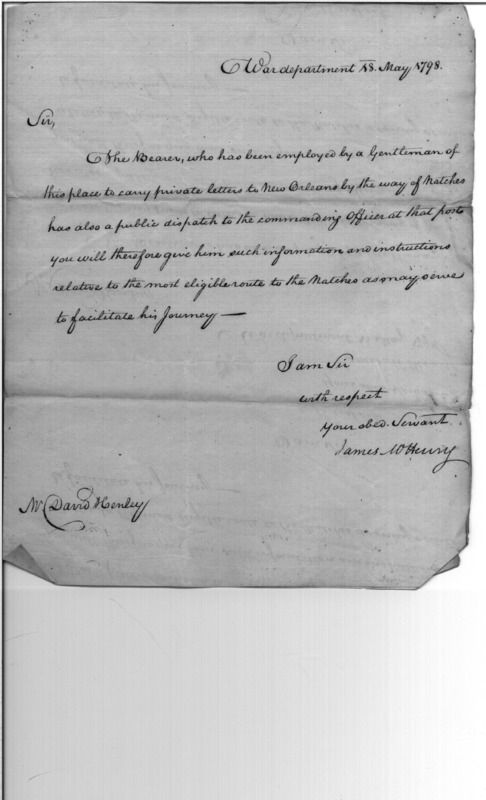- Document: Request for David Henley to assist bearer of letters for commanding officer of Natchez post and New Orleans