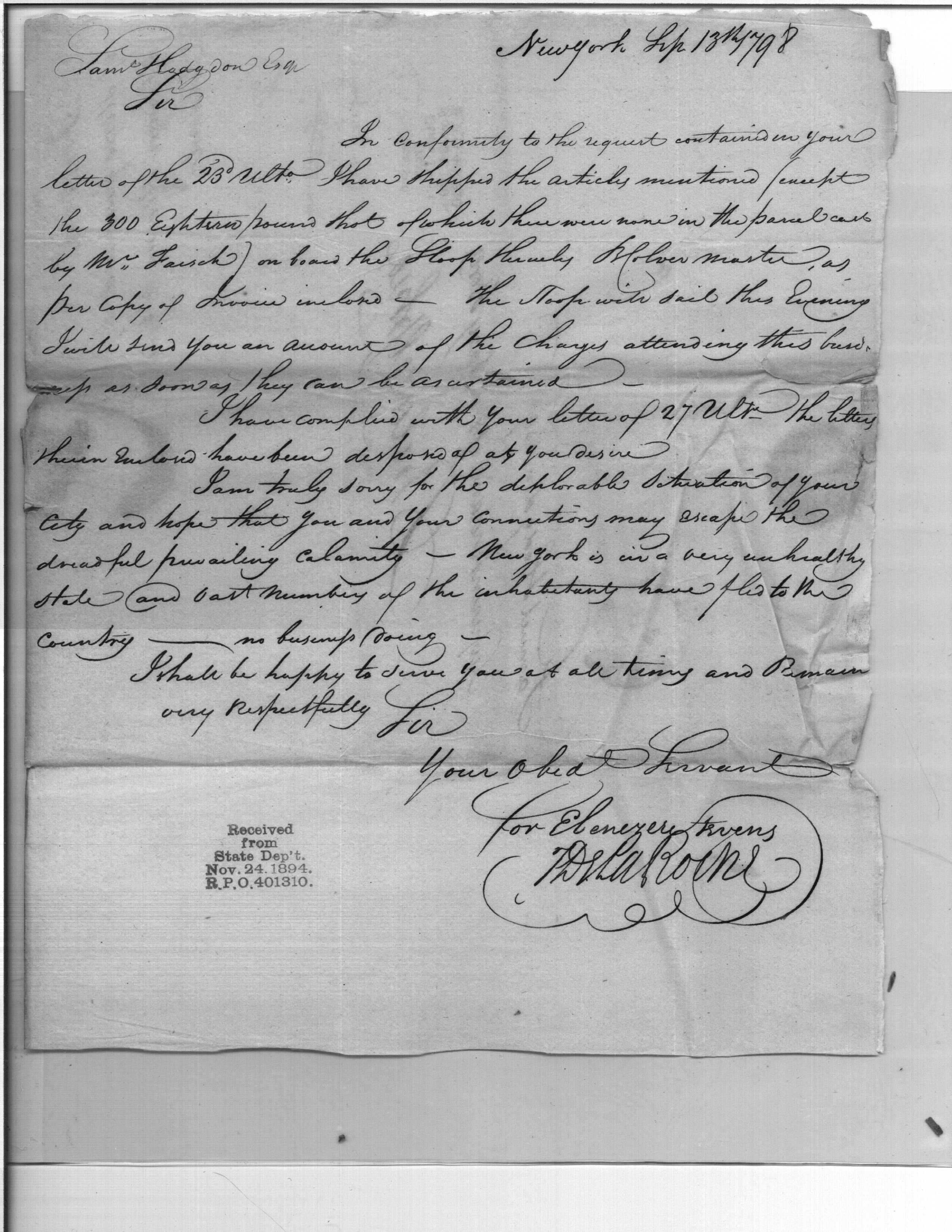 - Document: Letter confirming shipment of military articles; and reference to Yellow Fever epidemic