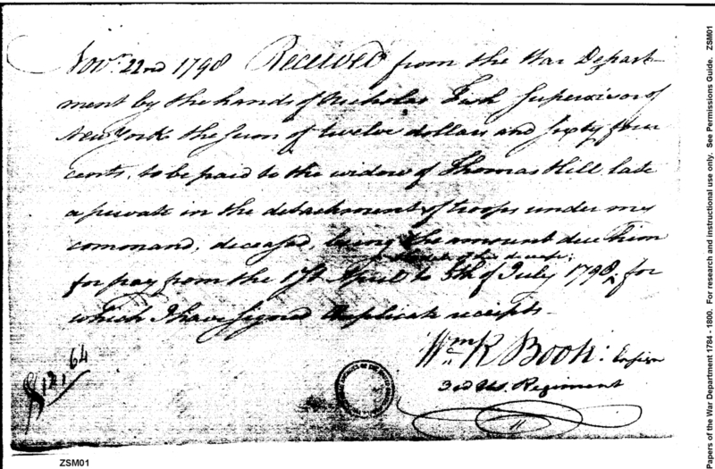 - Document: Receipt from Ensign Boote for monies to be paid widow of Private Thomas Hill
