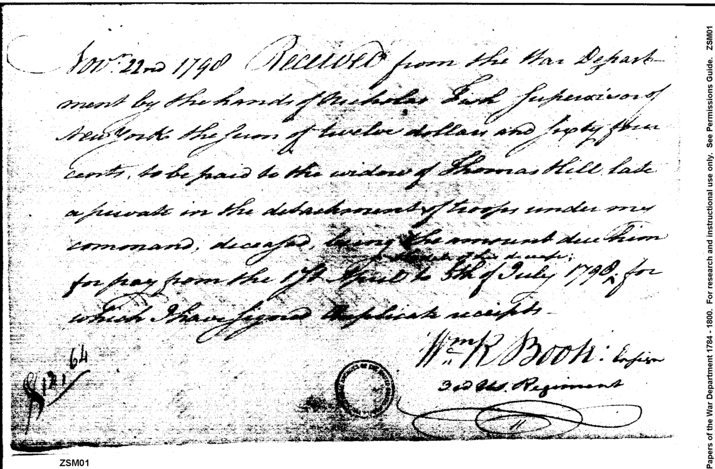 Document ViewerReceipt from Ensign Boote for monies to be paid widow of Private Thomas Hill