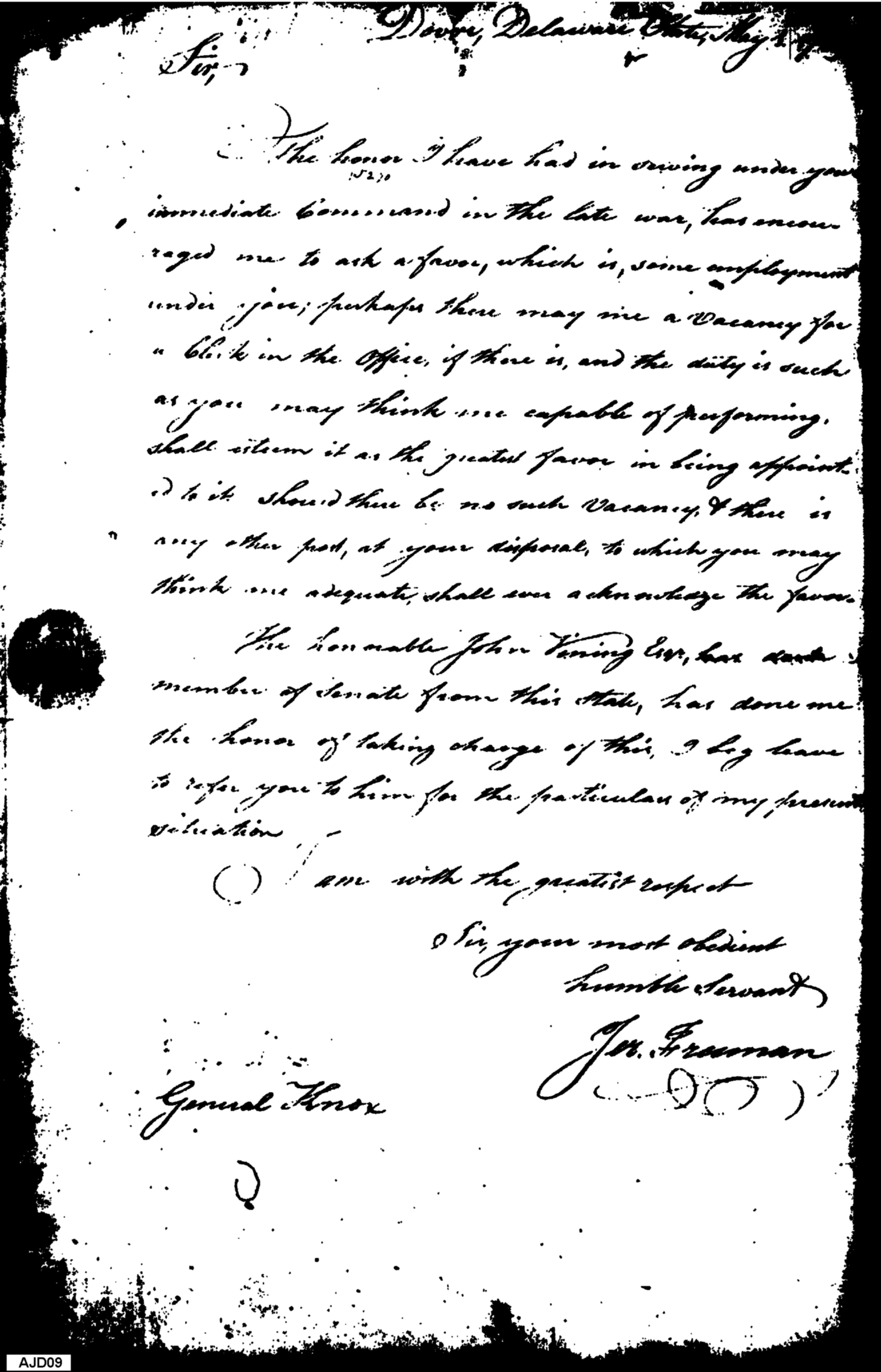 - Document: Freeman solicits Knox for the position of clerk in the War Department