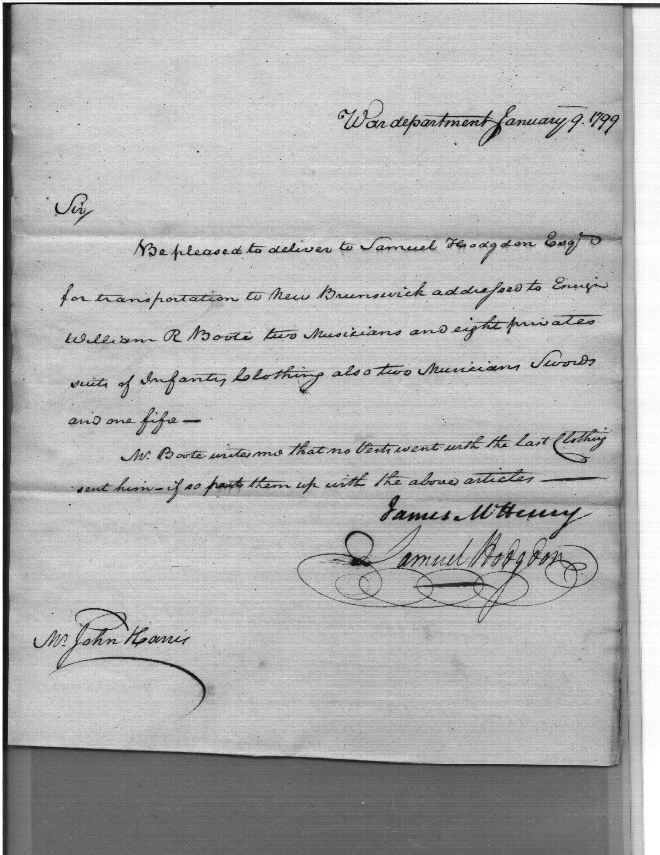 - Document: Request for Issue of Clothing, Swords & a Fife to New Brunswick Troops