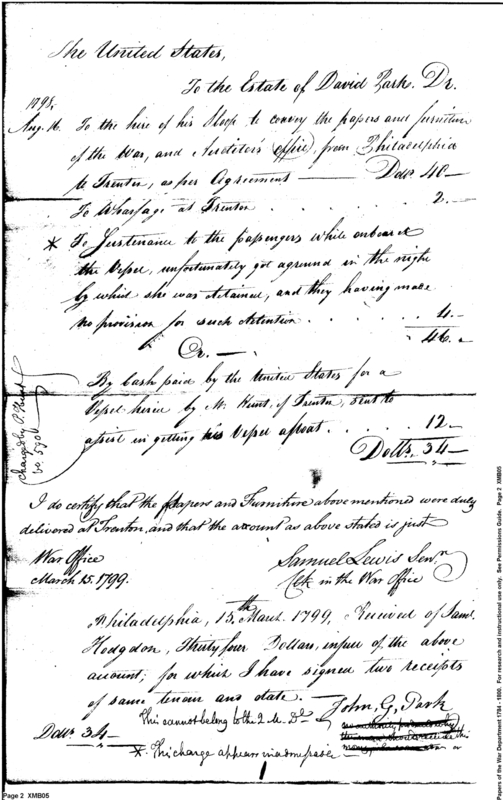 - Document: Receipt to Hodgdon for transportation of War Department papers and furniture to Trenton as part of estate of David Park.