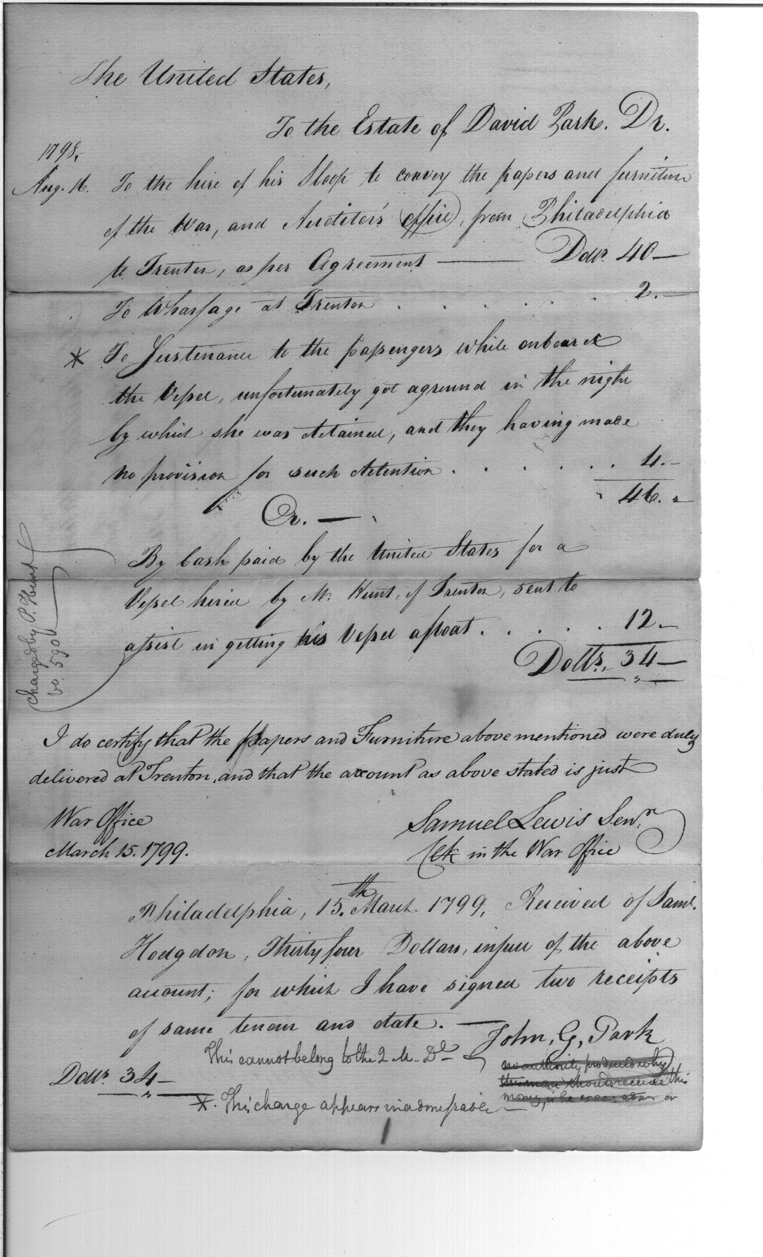 - Document: Receipt to Hodgdon for transportation of War Department papers and furniture to Trenton as part of estate of David Park.