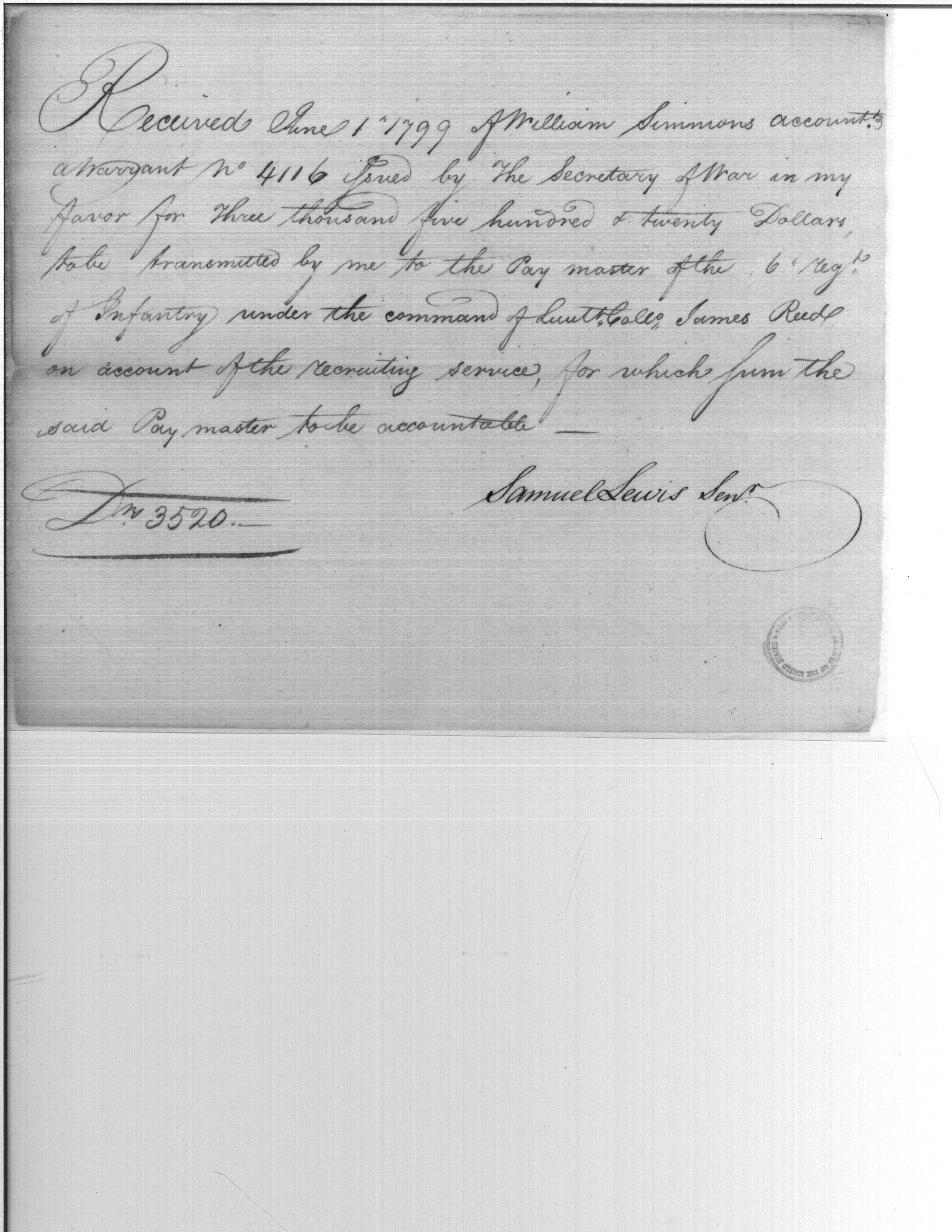 - Document: Receipt of Money to be Transmitted to Paymaster 6th Regiment of Infantry for Recruiting