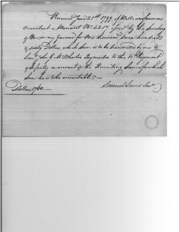 - Document: Receipt of William Simmons to Samuel Lewis transmitted to Lieutenant John G. McWhorter, paymaster of 11th Regiment of Infantry