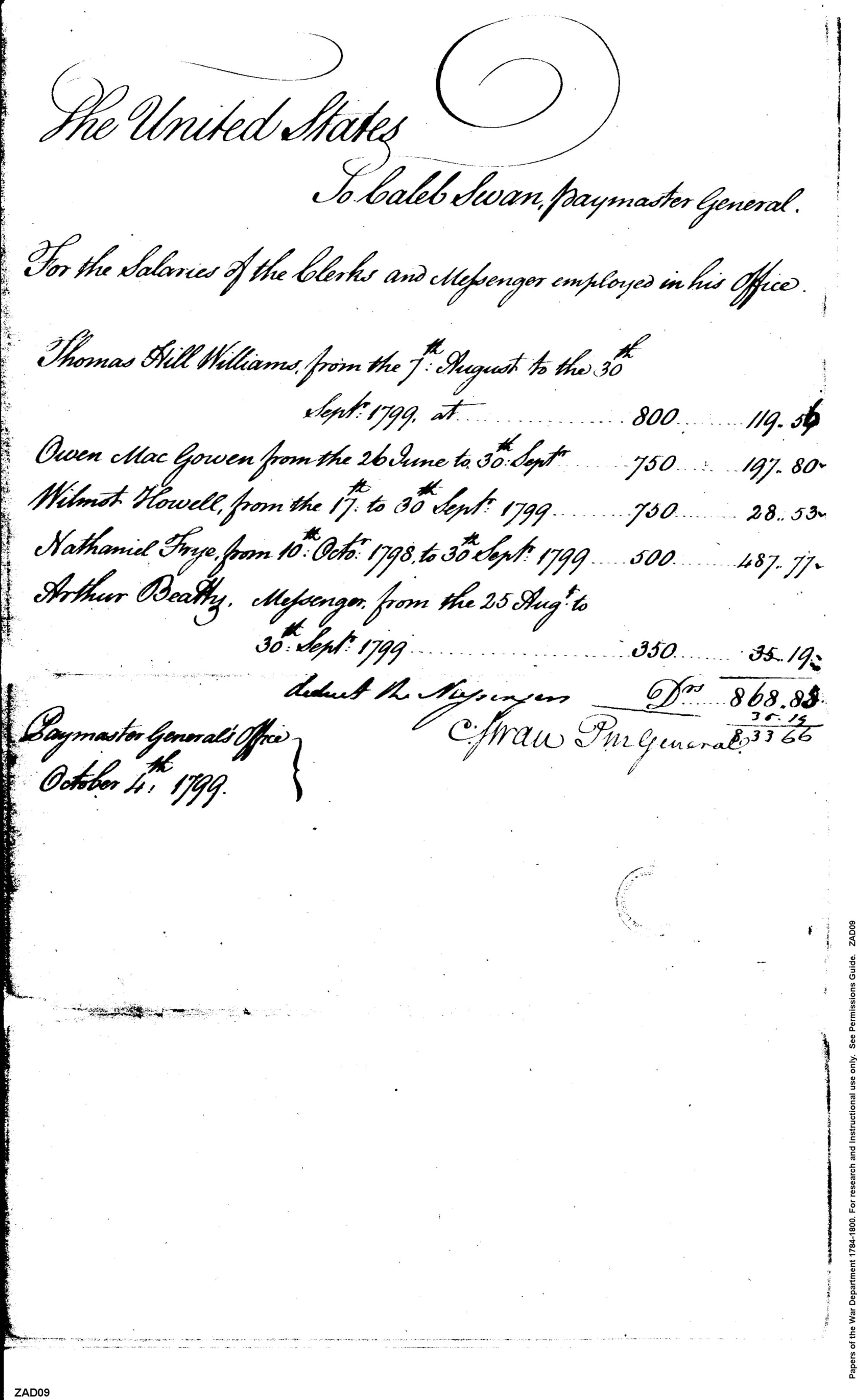- Document: Salaries of clerks and messengers employed in office of Caleb Swan