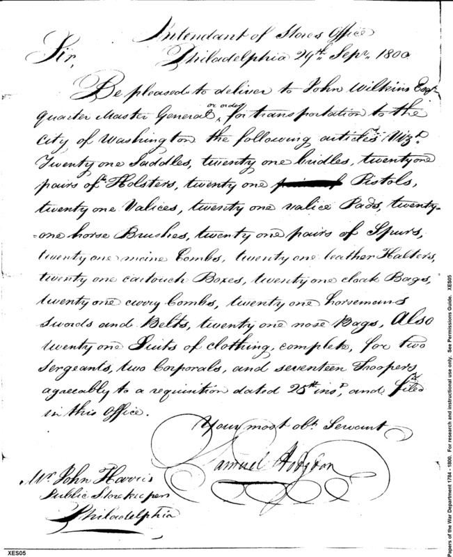 - In source: Collection: Correspondence, Reports, Returns, Bills, Accounts Current' Statements, Receipts, Vouchers and Contracts of Philadelphia Supply Agencies (Coxe and Irvine Papers), 1794-1842. (RG92)