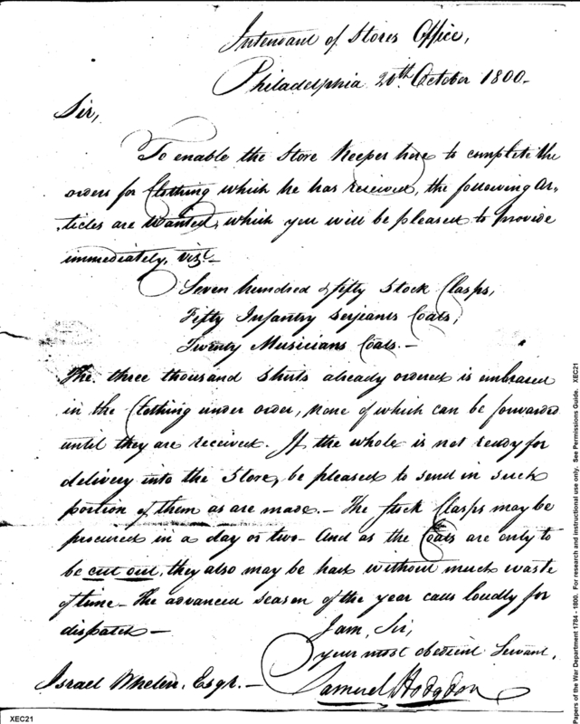 - In source: Collection: Correspondence, Reports, Returns, Bills, Accounts Current' Statements, Receipts, Vouchers and Contracts of Philadelphia Supply Agencies (Coxe and Irvine Papers), 1794-1842. (RG92)