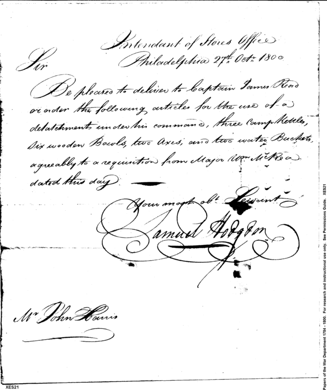 - In source: Collection: Correspondence, Reports, Returns, Bills, Accounts Current' Statements, Receipts, Vouchers and Contracts of Philadelphia Supply Agencies (Coxe and Irvine Papers), 1794-1842. (RG92)