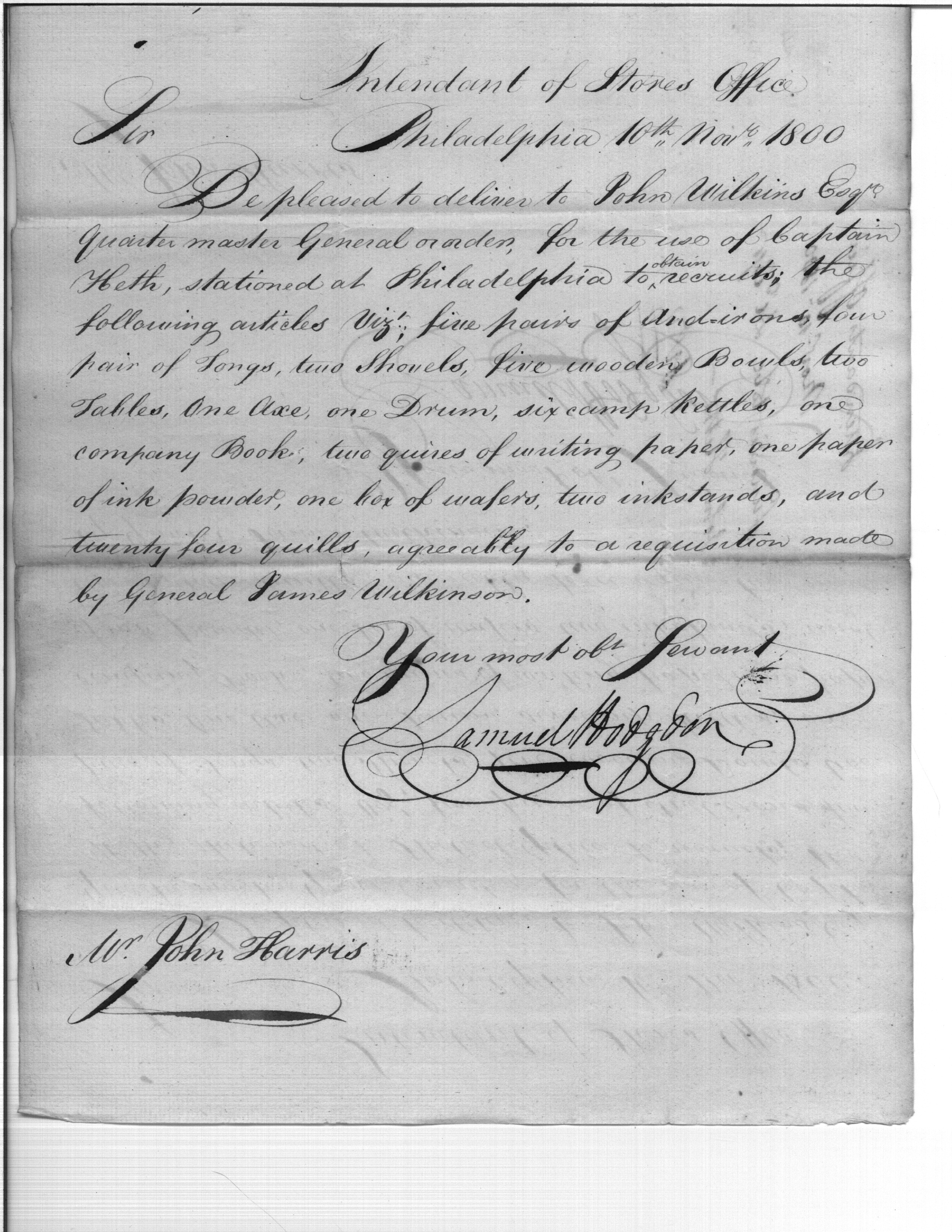 - Document: Items to John Wilkins, Quarter Master General, for Captain Heth, Recruiting in Philadelphia