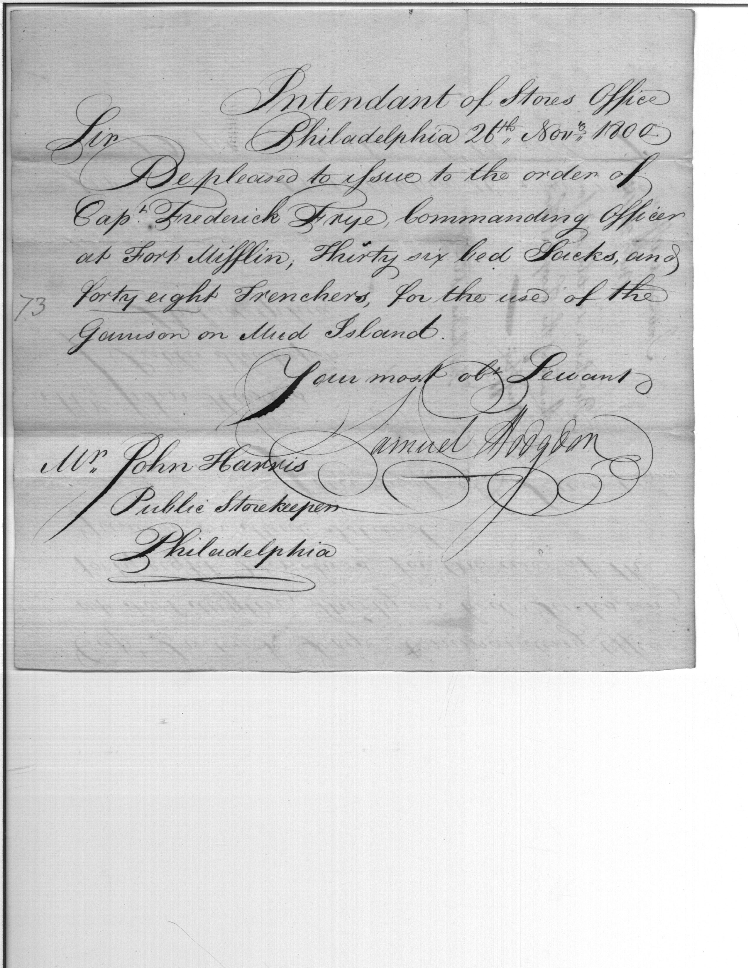- Document: Request for Issue of Bed Sacks & Trenchers for Use at Fort Mifflin