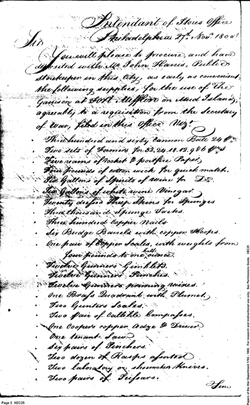 - In source: Collection: Correspondence, Reports, Returns, Bills, Accounts Current' Statements, Receipts, Vouchers and Contracts of Philadelphia Supply Agencies (Coxe and Irvine Papers), 1794-1842. (RG92)