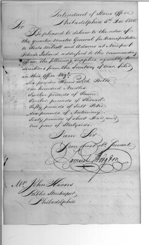 - Document: Request for Issue of Assorted Military Supplies to Forts Wolcott & Adams