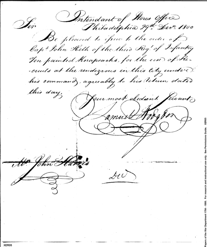 - In source: Collection: Correspondence, Reports, Returns, Bills, Accounts Current' Statements, Receipts, Vouchers and Contracts of Philadelphia Supply Agencies (Coxe and Irvine Papers), 1794-1842. (RG92)