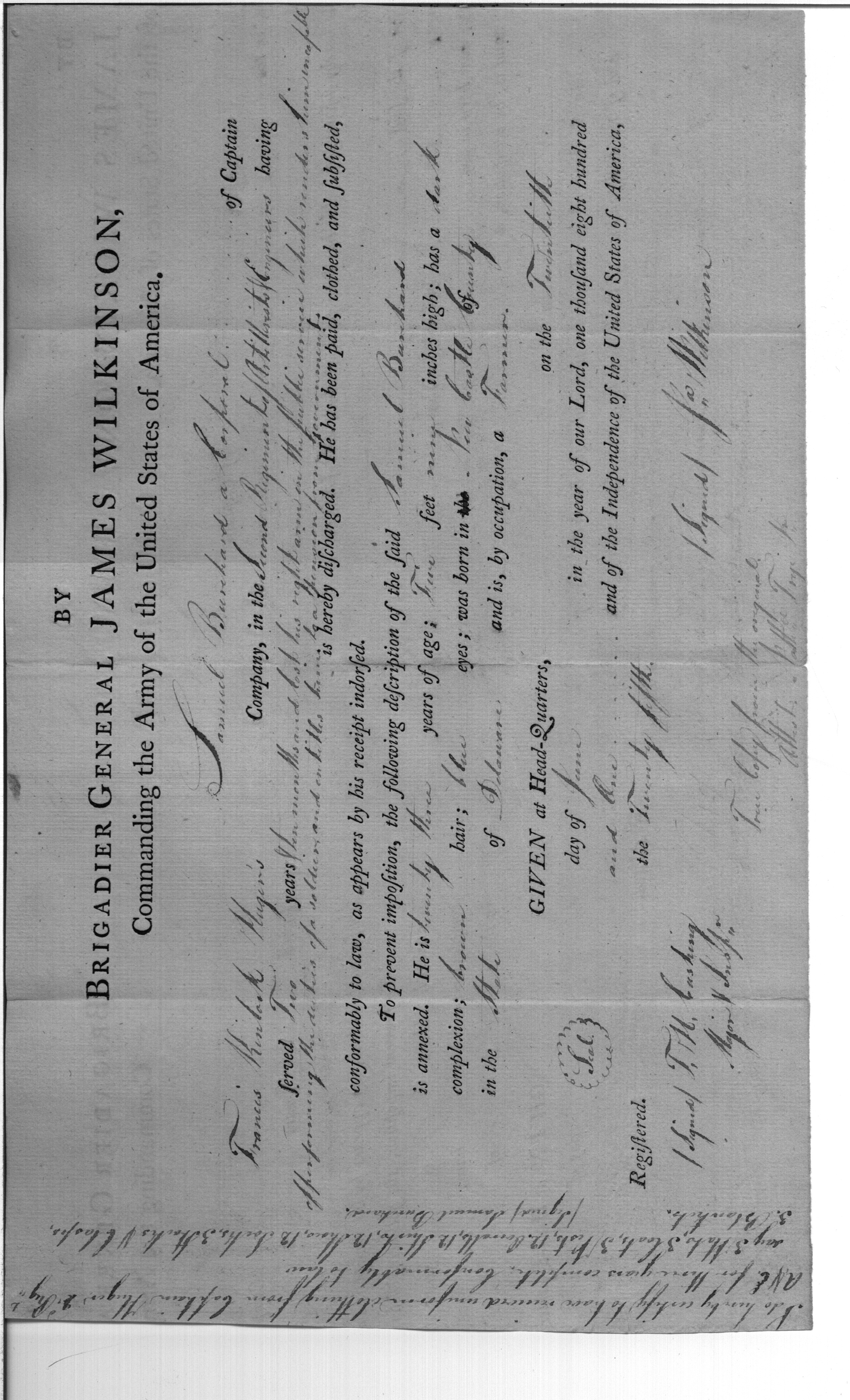 - Document: Discharge of Samuel Burchard from the army, by Brigadier General James Wilkinson