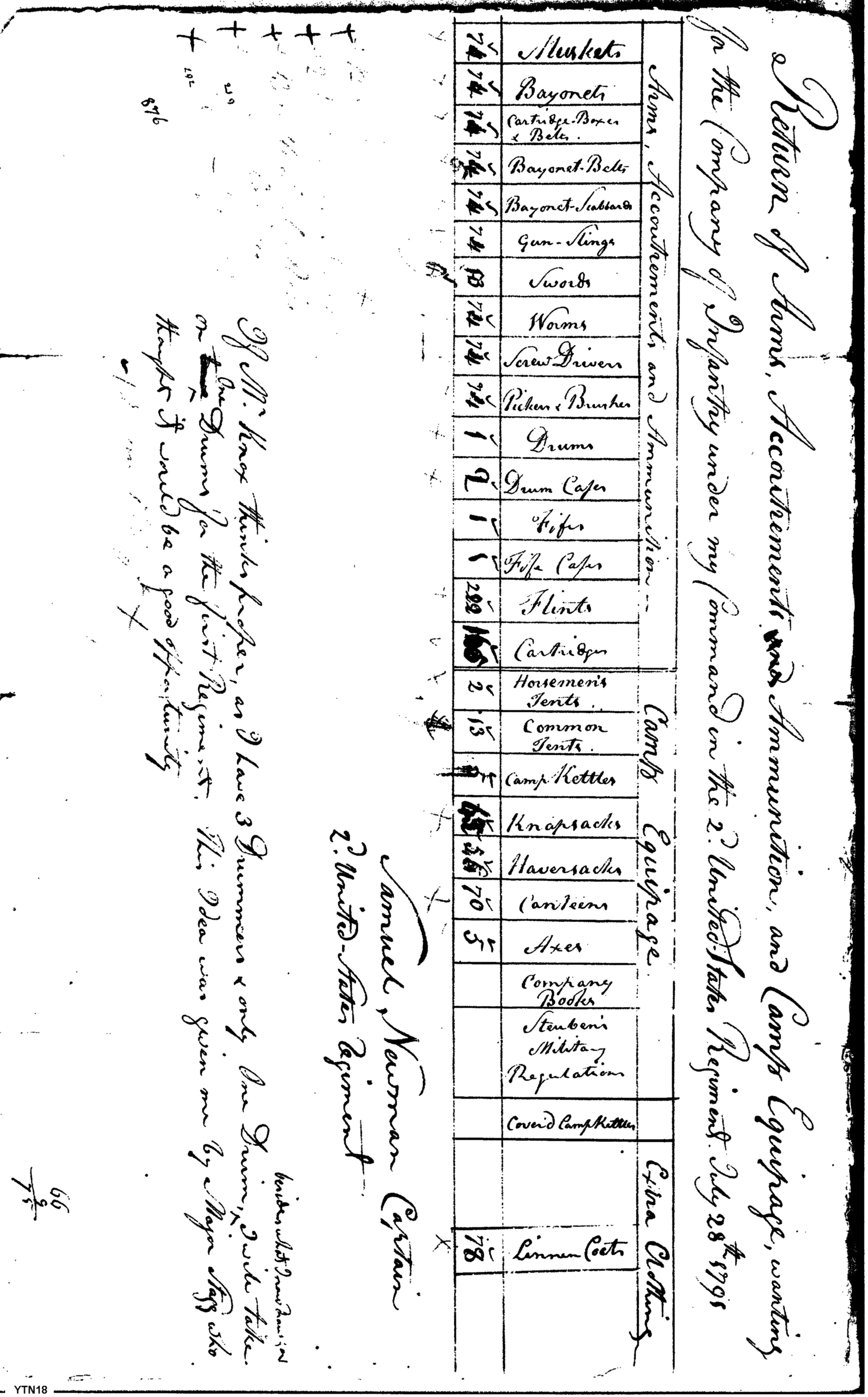- Document: Return of arms, accoutrement and clothing wanting by Captain Samuel Newman.