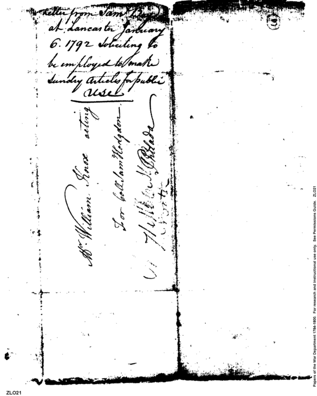 - Document: Letter from Sam Boyd at Lancaster Ohio soliciting to be employed to make sundry articles for public use in the wake of unfortunate St. Clair expedition