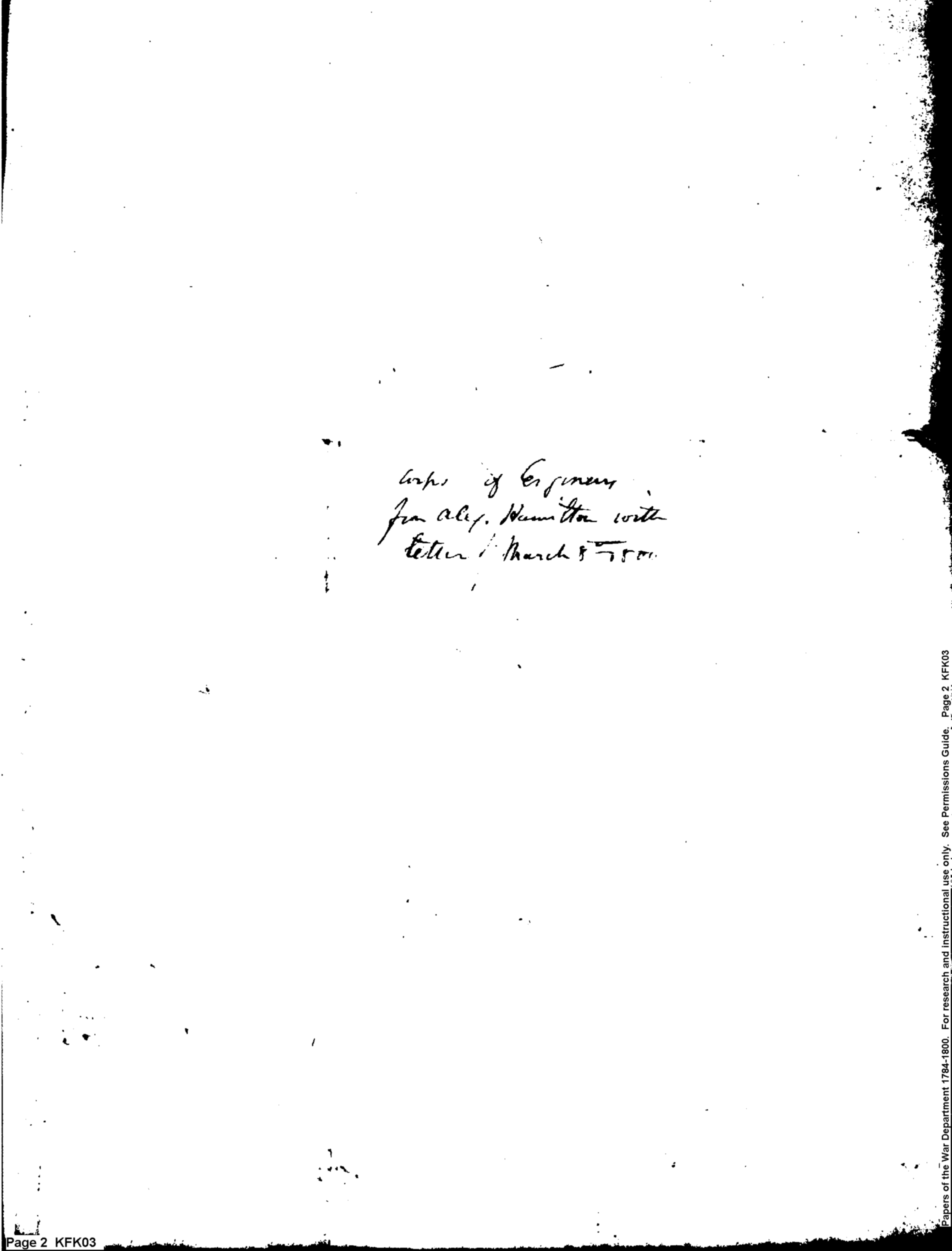 An Act Organizing Artillerists and Engineers: Page #2 Original title: 1800/KFK03_2.jpg Protection: Open to all Expiration: Never Status: Completed Mark this revision as complete Cancel An Act Organizing Artillerists and Engineers: Page #2 Go full screenExit full screen Layout Reset Corps of Engineers from Alex. Harris [illeg] with letter of March 8th--1800 [?]