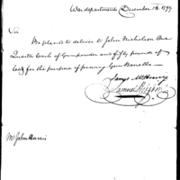 | Request for Issue of Powder & Lead for Proving Gun Barrels | Collection: Consolidated Correspondence File, 1794-1890. (RG92) | [unknown] |