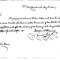 | Request for Issue of Musket Stocks to Robert McCormick | Collection: Consolidated Correspondence File, 1794-1890. (RG92) | B: 769 |