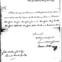 | Request for delivery of ledgers to keeper of military stores | Collection: Post Revolutionary War Papers, 1784-1815. (RG94) | B:443 |