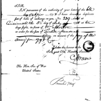 | Caleb Swan reports to McHenry that he has drawn up duplicate set of bills of exchange | Collection: Subject File of the Naval Records Collection | B:143 |