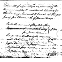 | Estimate of Expenditures for the Factory, Arsenal, and Canal at Harpers Ferry, June 1800 | Collection: Receipts for Moneys Advanced (Advances), 1793-1855. (RG217) | B: 4 |