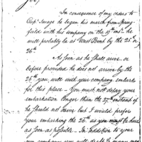As foon as he fhall arrive, or before provided he does not arrive by the 26th you will with your company embark for this place - you must not delay your embarkation longer than the 27th instant if he fhould not arrive but I would prefere you embarking the 26th as you must be here as foon as pofsible - In addition to your own company you will not draft fo many men from Capt. Savages company as to complete your to 52 non-commifsioned and privates including