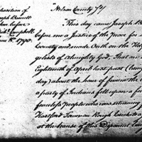 "This day came Joseph Barnet Ep before me a Justice of the peace for said County and suade Oath of the Holy Evan-gelists of Almighty God, That on the Eighteenth of April last past (being lords day) about the hour of five in the Evening a party of Indians fell upon a few de-fenceless people who was returning from Hartford Town on Rough Creek to a function at the house of this Deponent being two miles