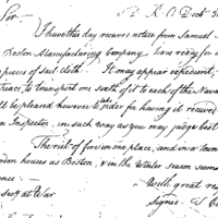 Received notice from Samuel Breck that the Boston Manufacturing Company has sail cloth ready for delivery. Requests information about how to act and inspect. Reminds the risk of fire in Boston.