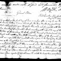 | [view document] (2 pages) | YTV21a (2 pages) | Collection: Orderly Book of the Deputy Adjutant General to District Commander Maj. Gen. Charles C. Pinckney, Apr-Jun 1800. 1 vol (no. 383/267). (RG98) | V: 383 |