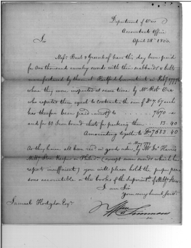 swords with their scabbards and belts manufactured by themselves at Hartford Connecticut in Feb. 7, 1799 where they were inspected same time by