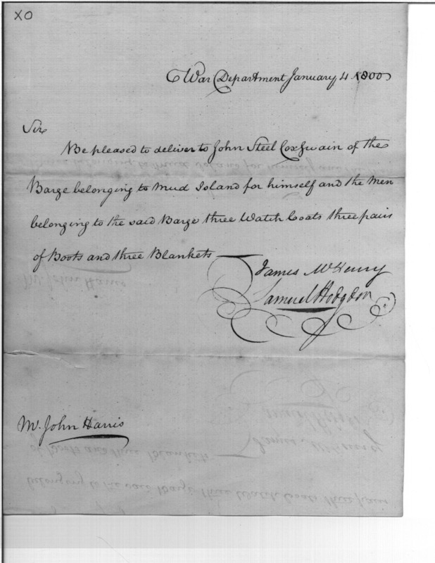Be pleased to deliver to John Steel Coxswain of the Barge belonging to Mud Island for himself and the men belonging to the said Barge three watch boats three pairs of Boots and three Blankets ___