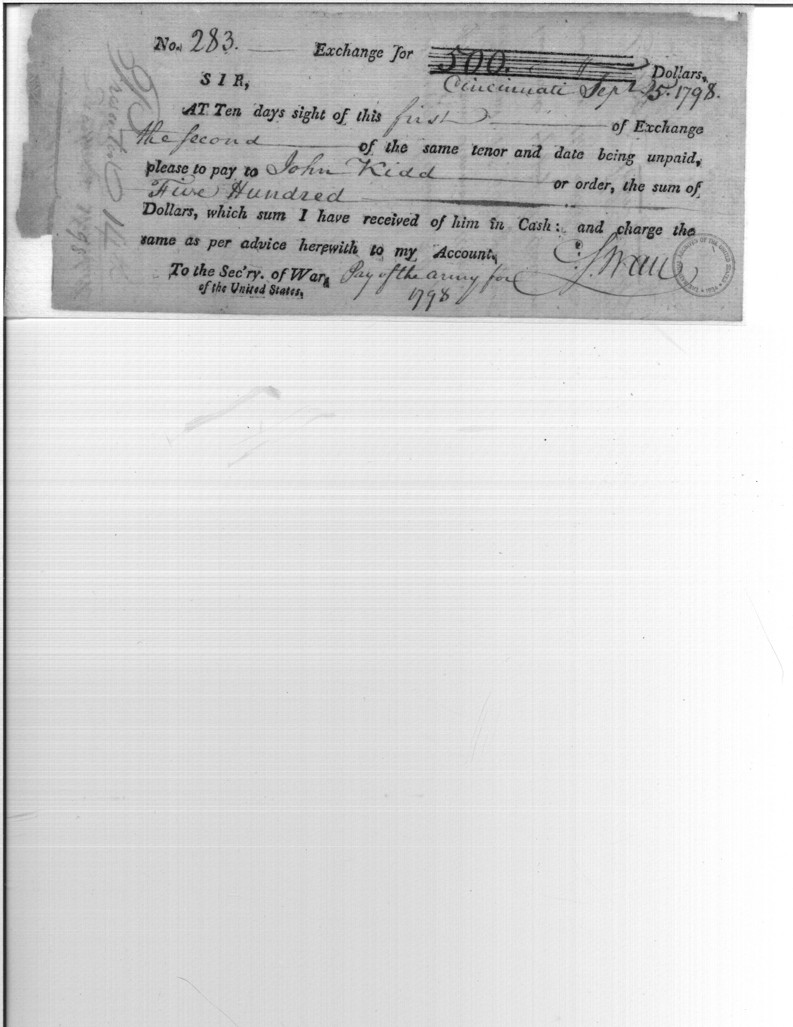 No. 283 Exchange for 500. Dollars, Cincinnati Sept 15. 1798.